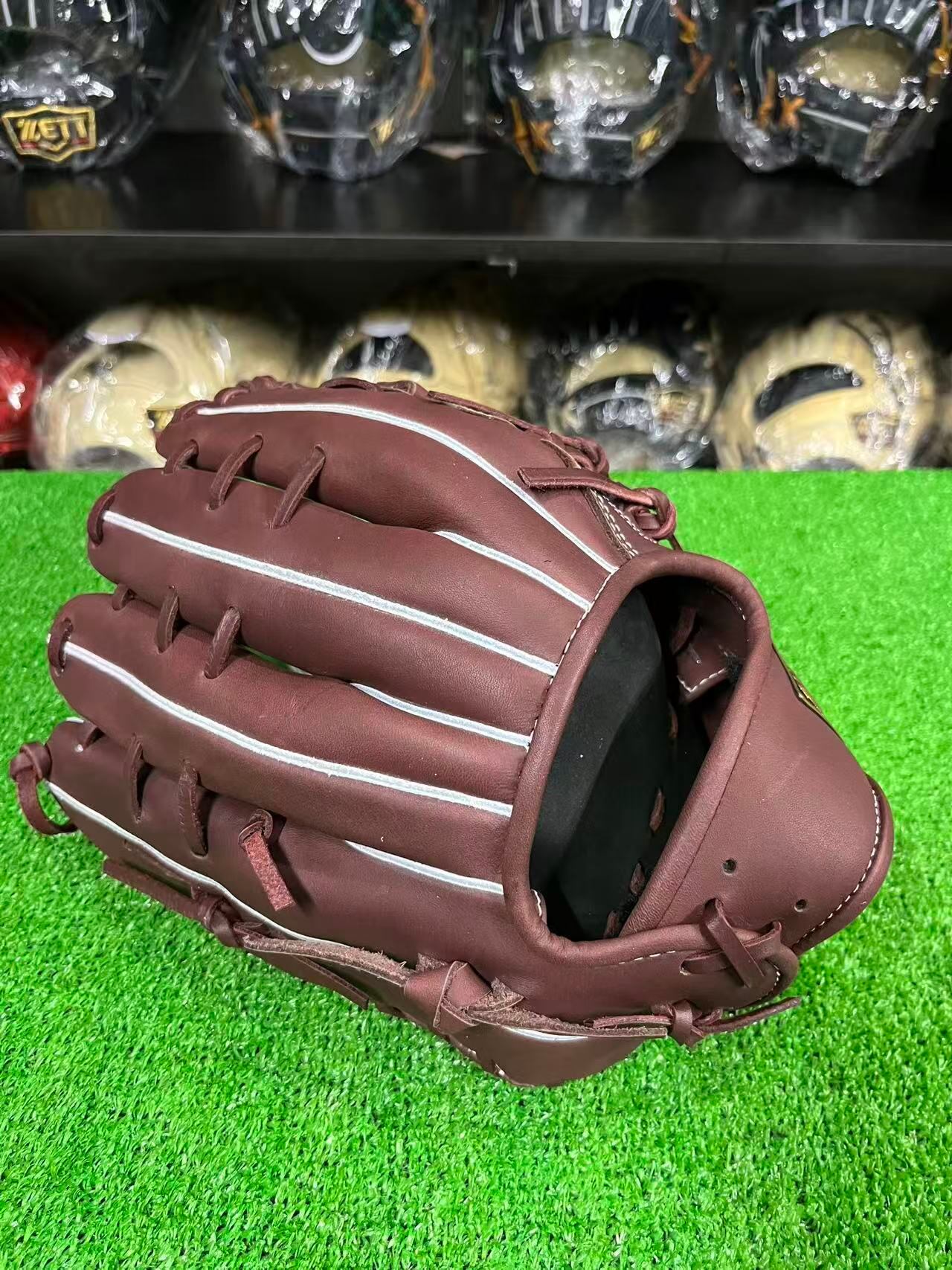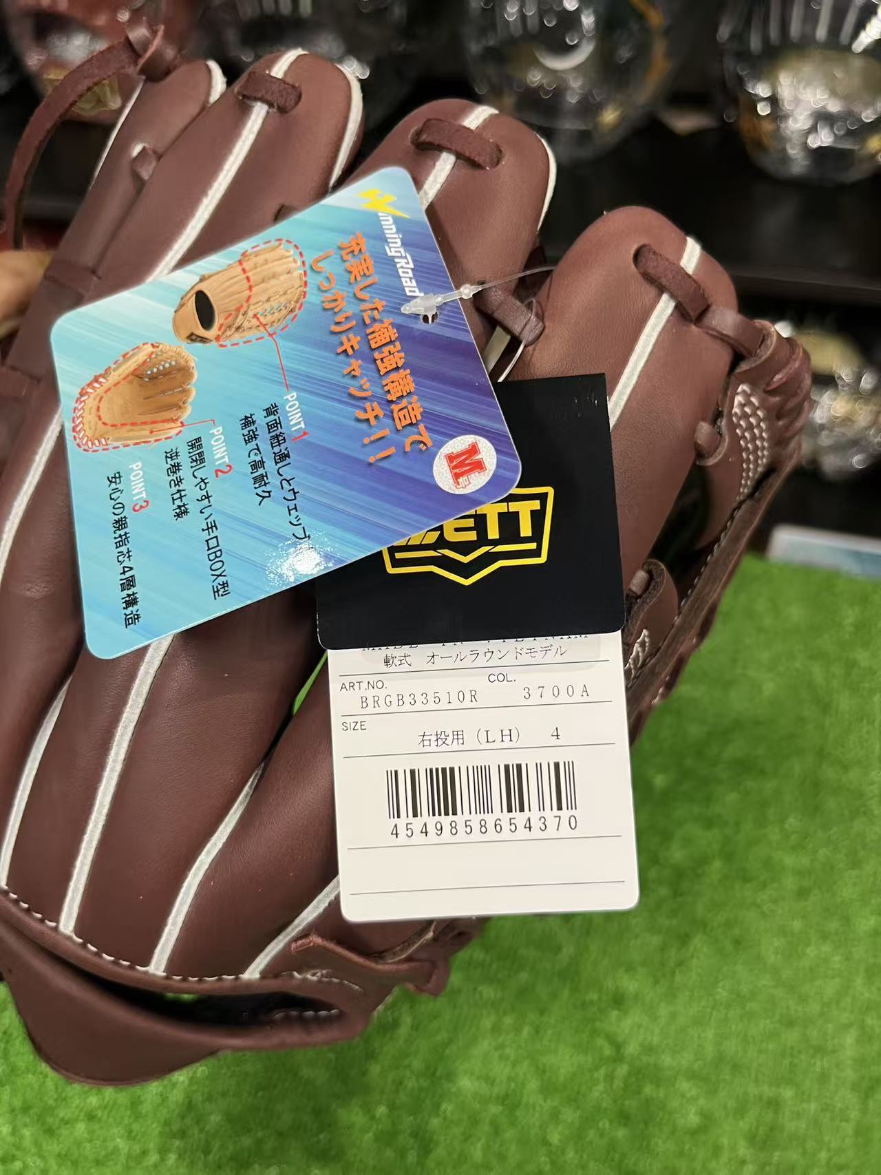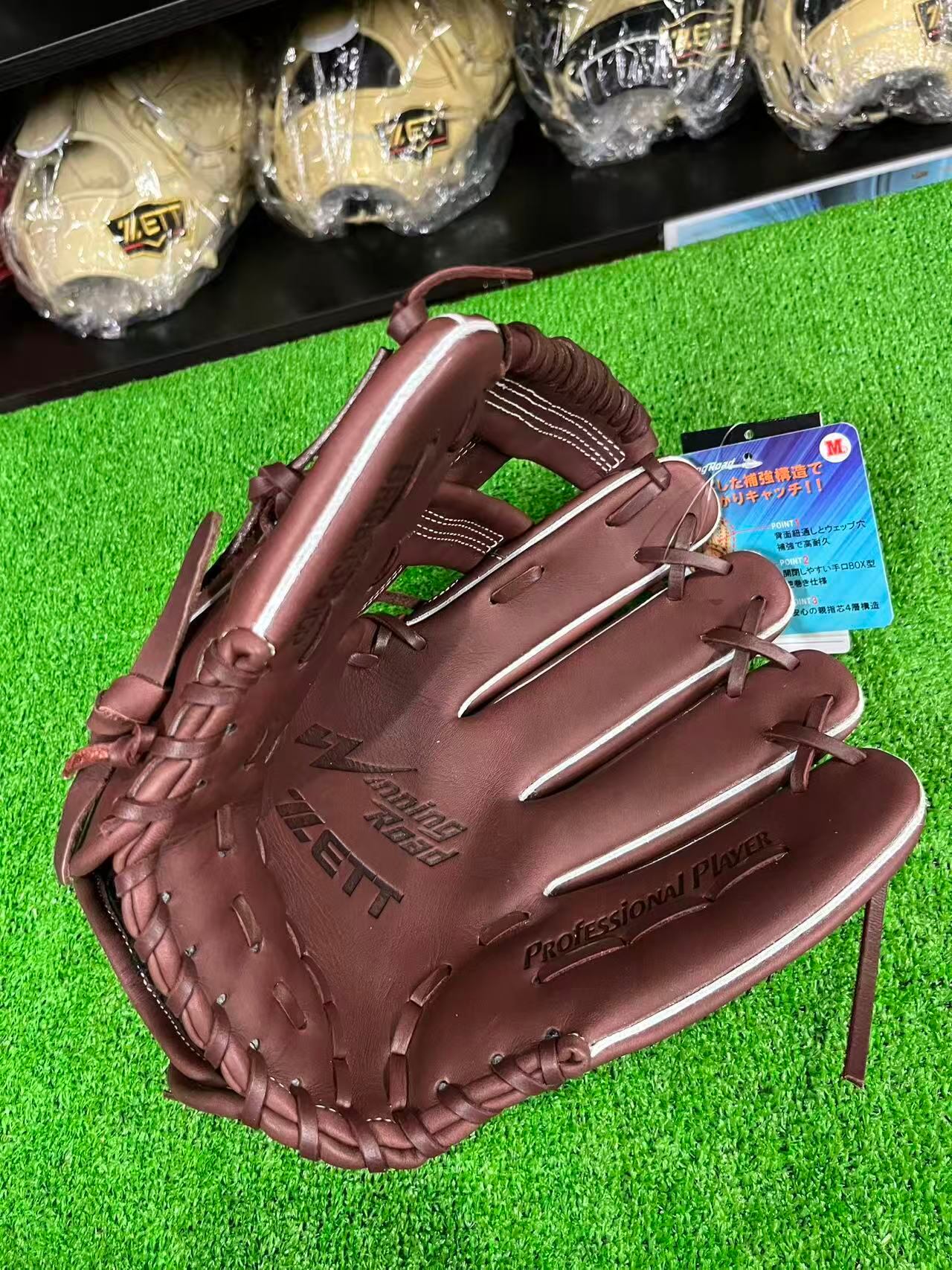 M号ボールに負けない、捕球ミスを軽減させるボックス型・手口逆巻・親指芯4層構造。背面紐通しとウェッブ部の紐穴補強も施した高耐久仕様。高級感あるウェルダーワッペンを親指付け根部に配した本格派仕様。